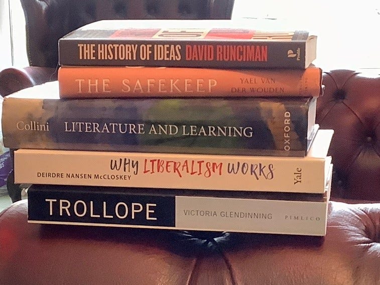 It has been a week for dipping into lots of different books, starting some and reading odd chapters of others. On the fiction front, I am enjoying Yael Van Der Wouden's 'The Safekeep' particularly, with its intriguing initial set up and sharply drawn characters. The dialogue is especially effective. On the non-fiction side, I have been equally thrilled and frustrated reading 'Why Liberalism Works' by Deirdre McCloskey. I will make further progress with these and let you know what I think in a future letter. Here is a snap of the books I have been reading for pleasure rather than for work of late:
